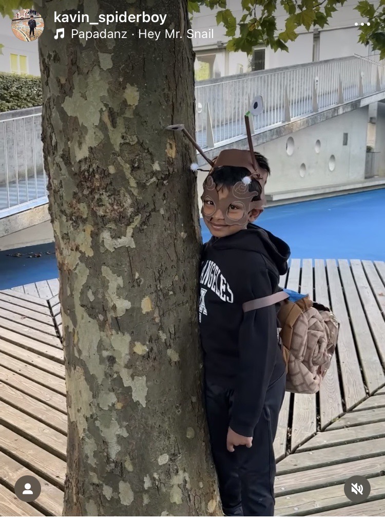 Kavin Spiderboy nous a tagué dans deux vidéos postées sur Instagram. Le 19 septembre, il s’était déguisé en escargot pour aller à son école de Nyon!