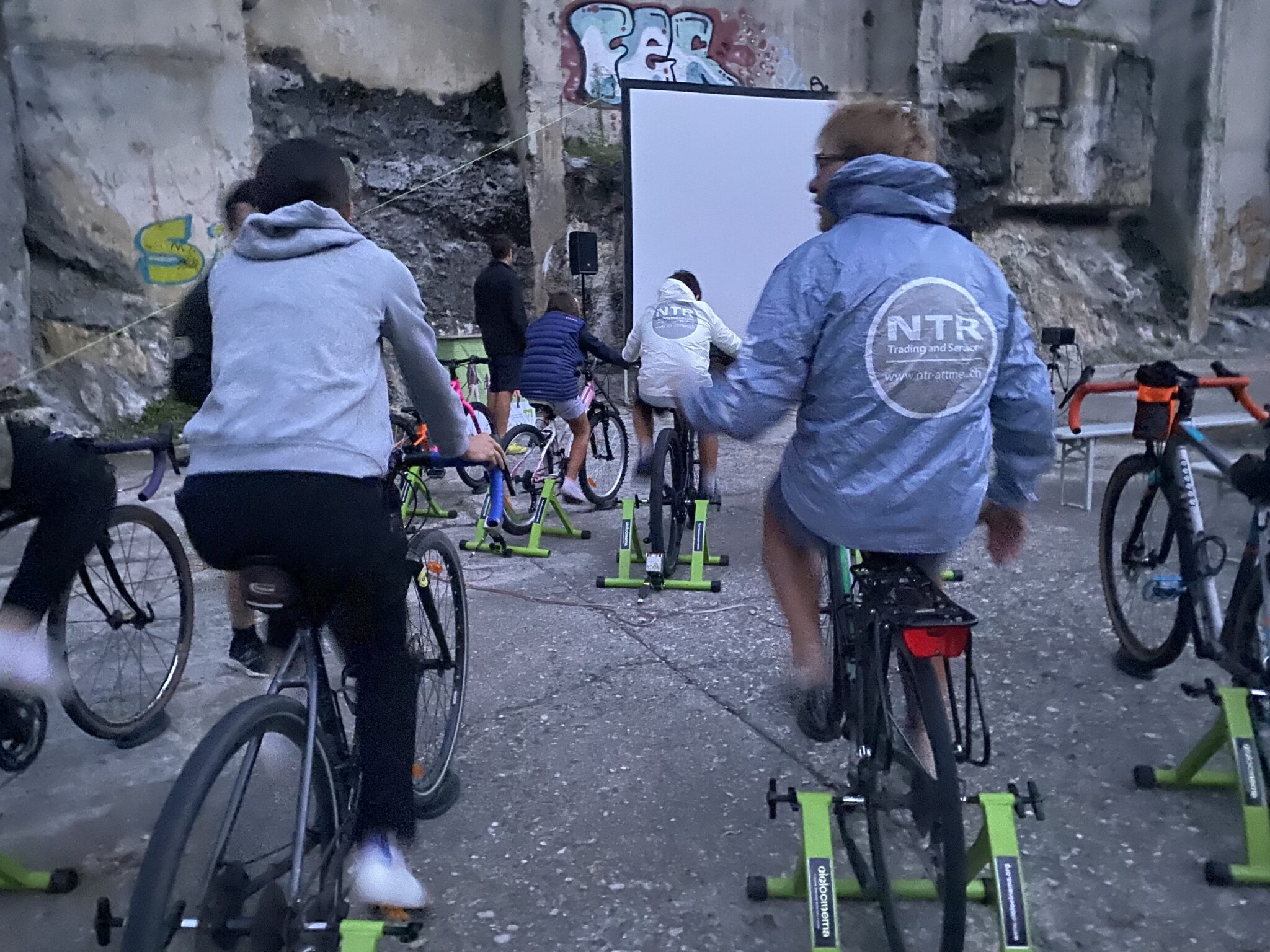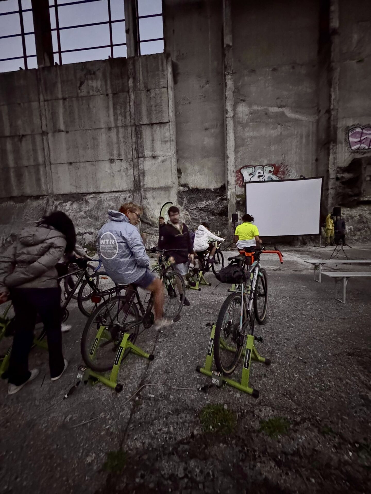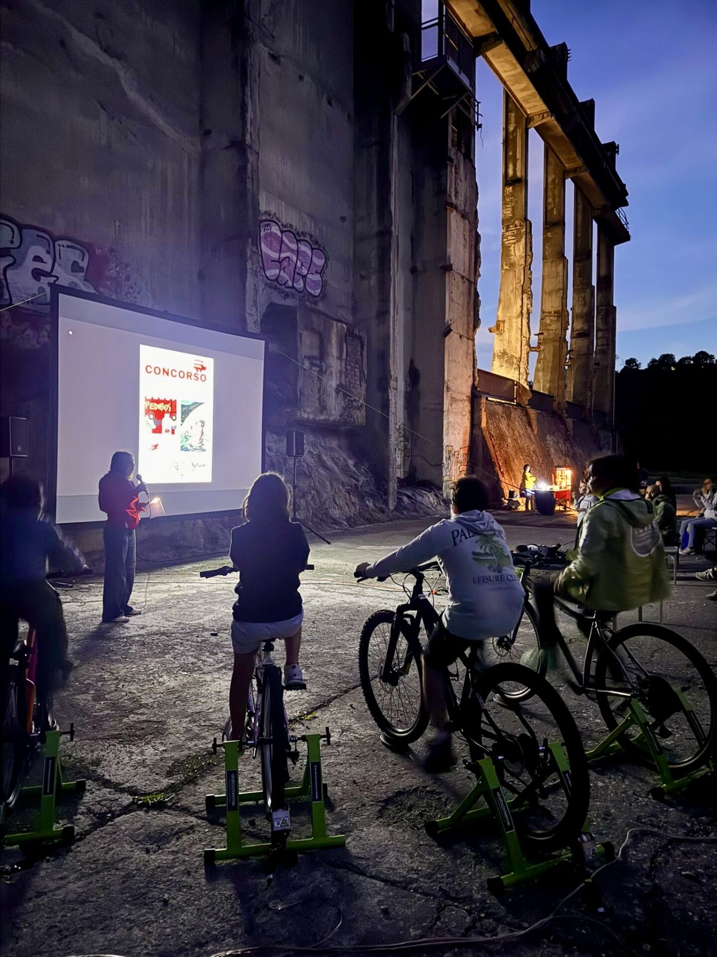Il pubblico non è solo spettatore: diventa parte attiva dell’evento, pedalando a turno per alimentare lo schermo.